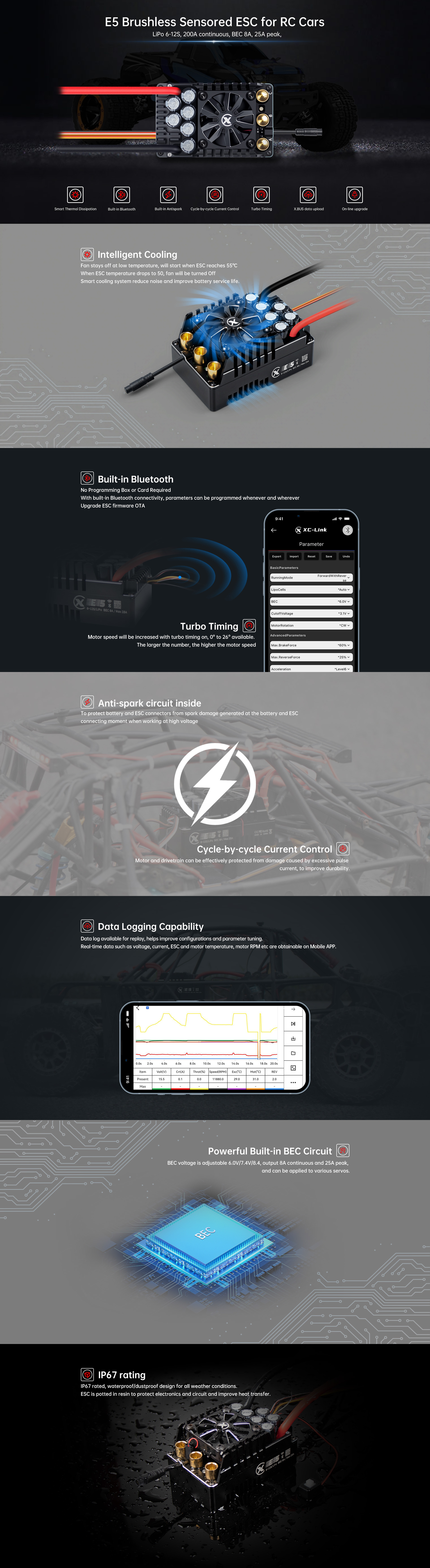 XC-ESC E5 Electronic Speed Controller 1/6 1/5 Scale ESC / 200A (6~12S)