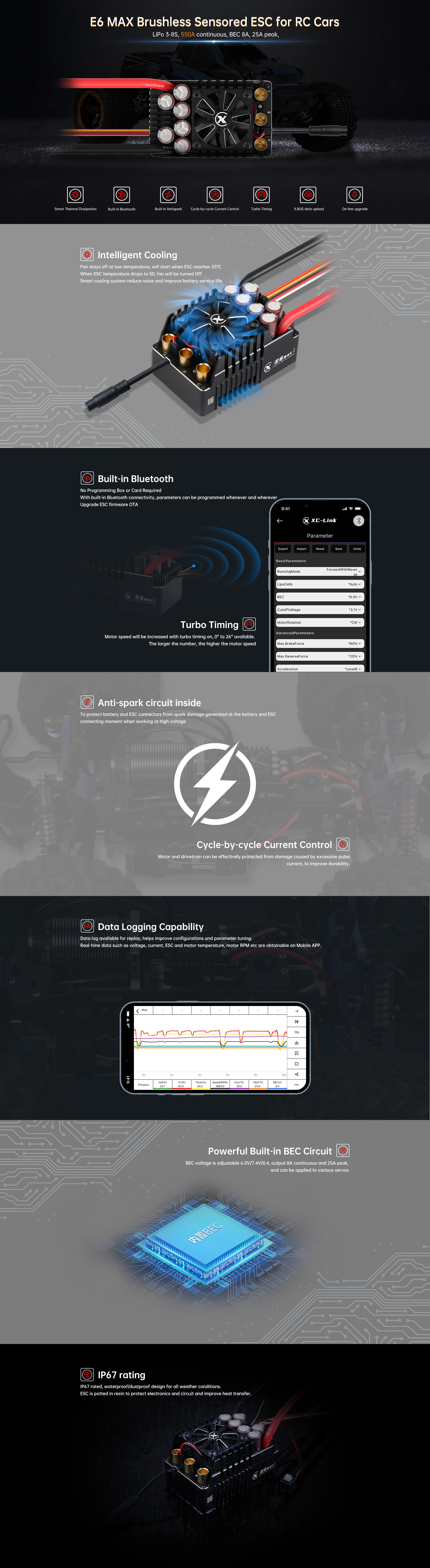 XC-ESC E6MAX 1/7 1/6 ESC for Speed RC Cars / 550A (3~8S)